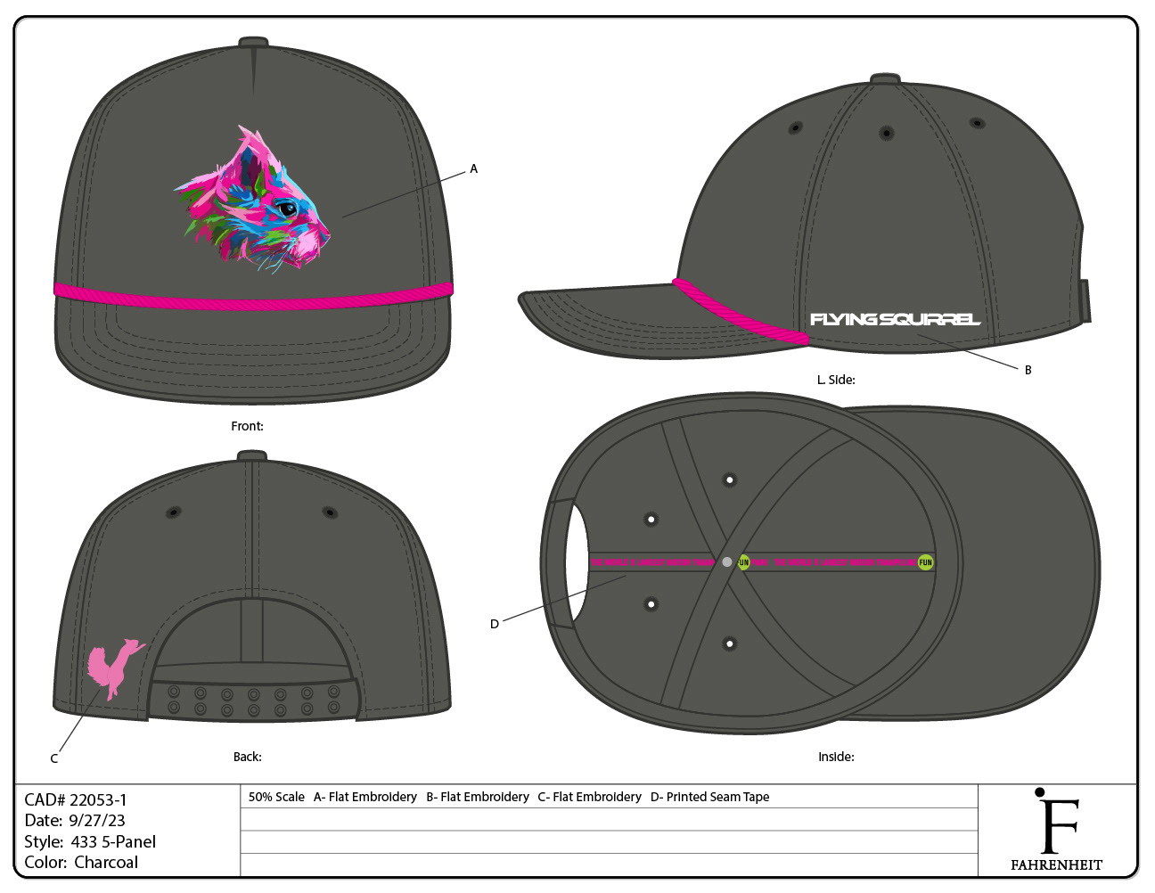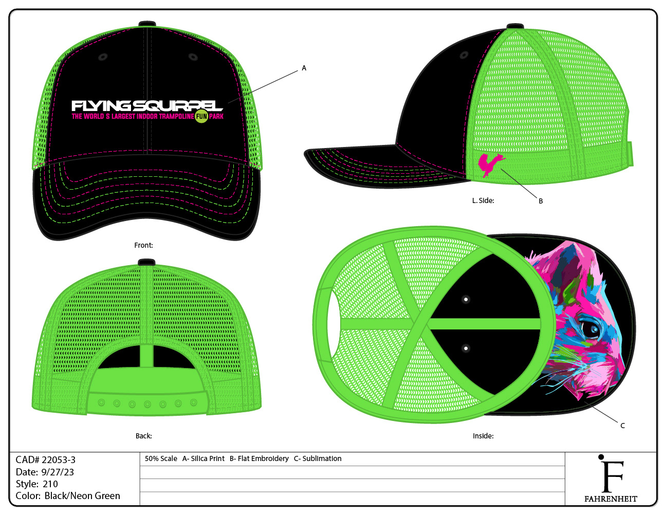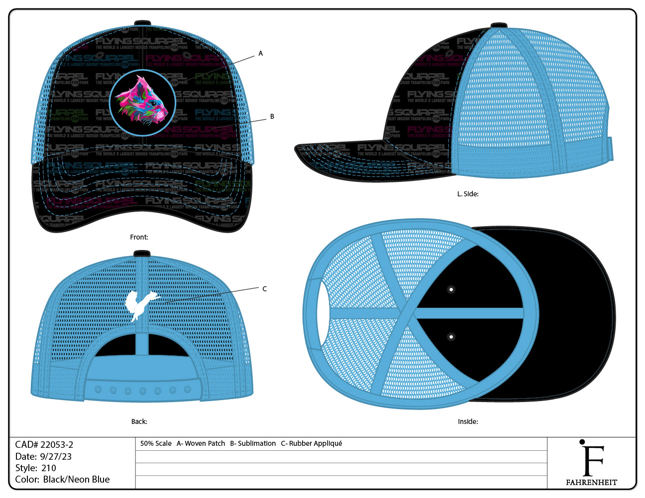 Cap mock ups for customer review and preproduction for Flying Squirrel Trampoline Park. Client: Fahrenheit Headwear