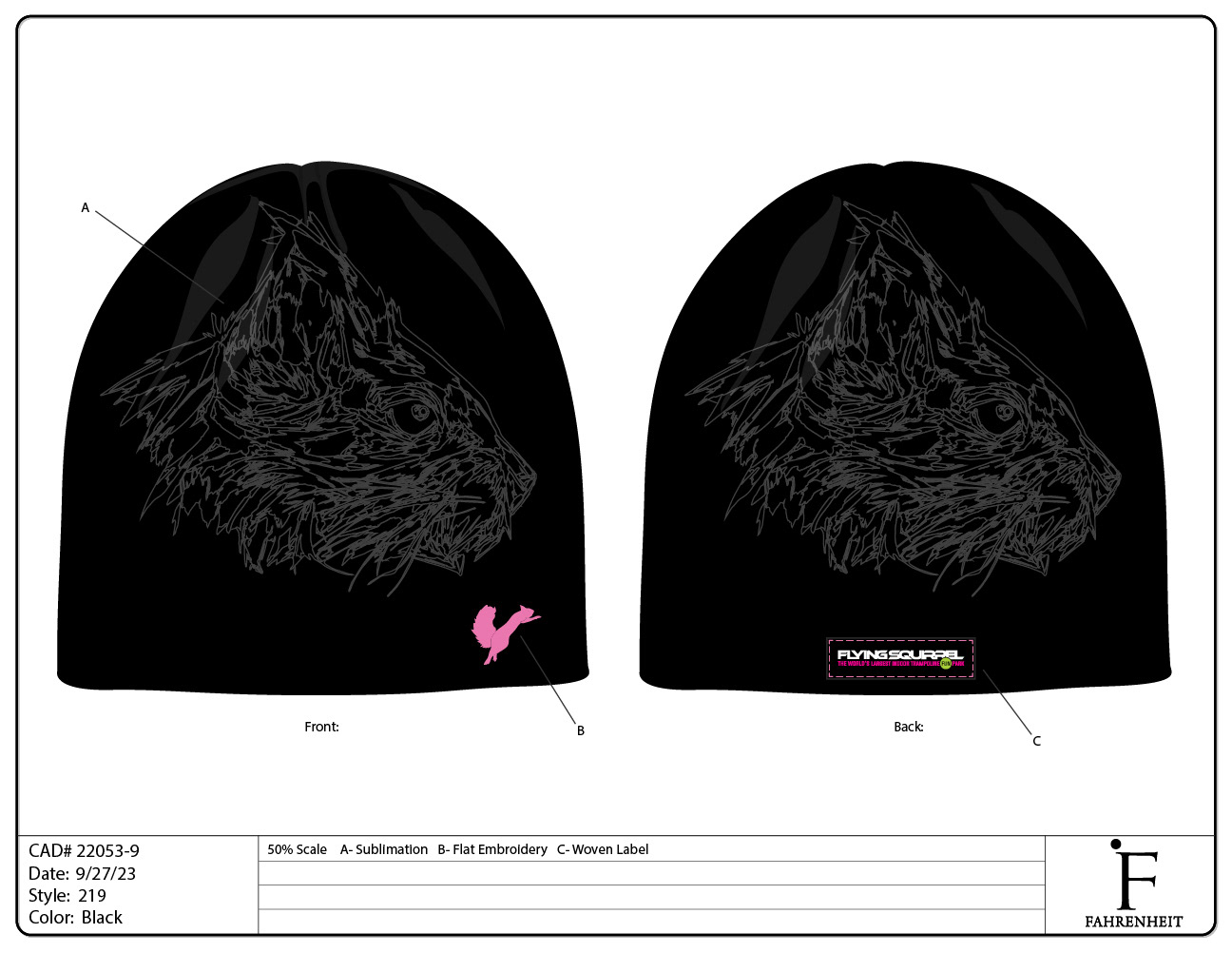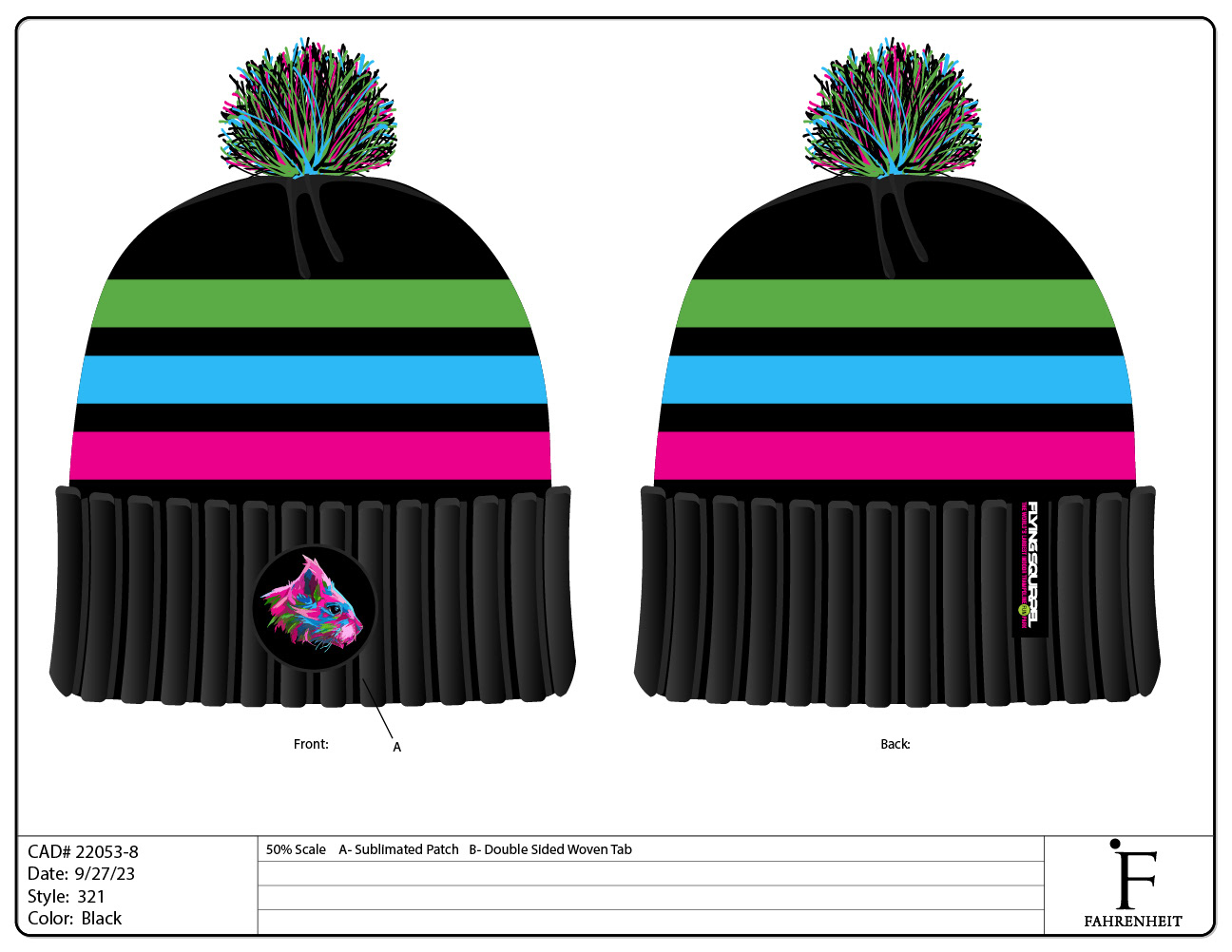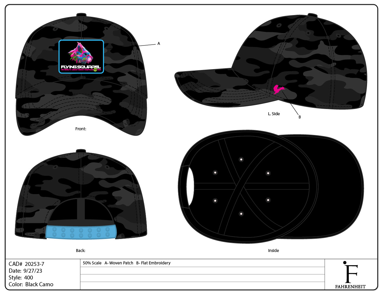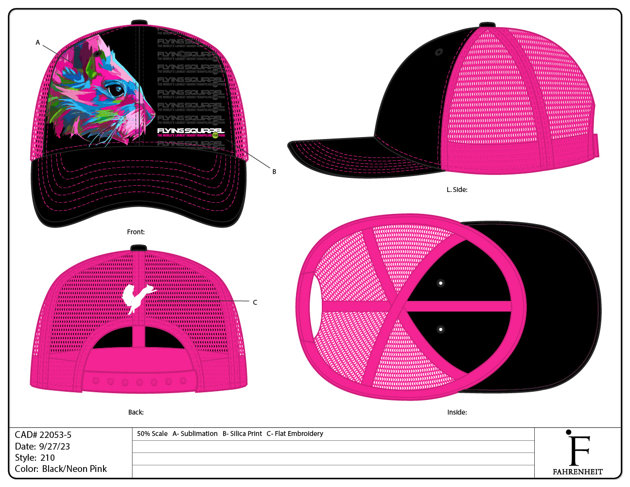 Cap mock ups for customer review and preproduction for Flying Squirrel Trampoline Park. Client: Fahrenheit Headwear